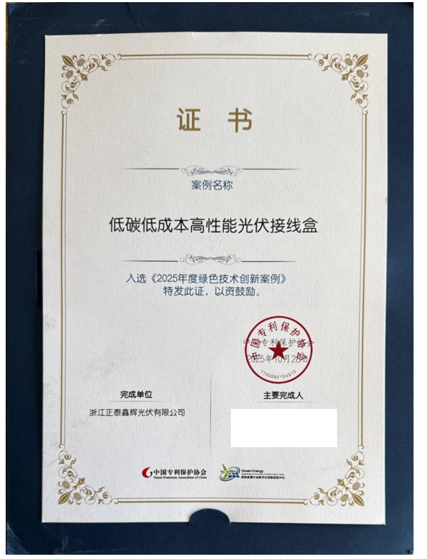 Zhejiang Zhengtai Xinhui Solar Co., Ltd. has earned a significant national accolade. The company's in-house developed "Low-Carbon, Low-Cost, High-Performance PV Junction Box" has been selected as a "2025 Green Technology Innovation Case," an honor jointly conferred by the China Patent Protection Association and the Digital Transformation Promotion Center for the Green Energy Industry.